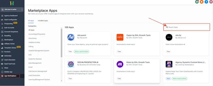To install FieldTask, you need to go to “App Marketplace” from the HighLevel web app.