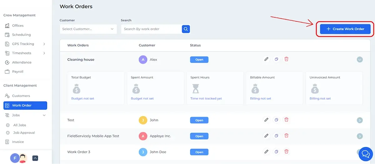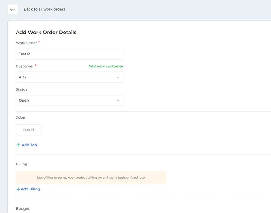 Now, you have to give a name and select a customer (you can create new customers by clicking on the "Add new customer" button). You can choose to add jobs directly under this work order, as well as add billing & budget info. Now, you can schedule these jobs.