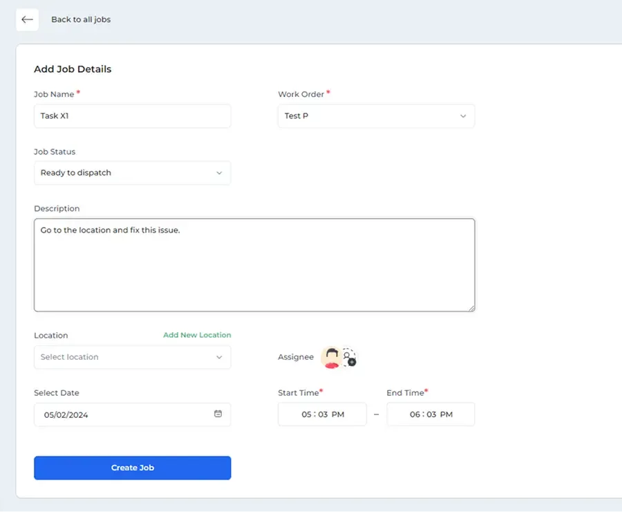 To set up new jobs, navigate to Jobs > All Jobs and click the "+ Create Job" button. Select your work order and update the job status, then input the location.
